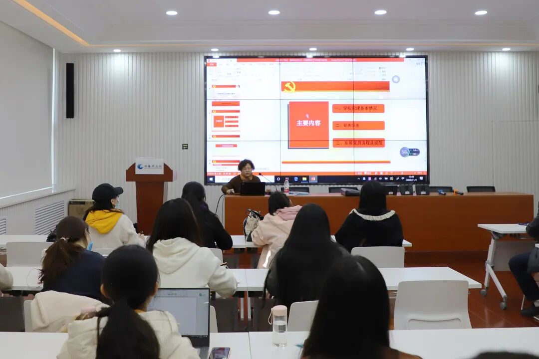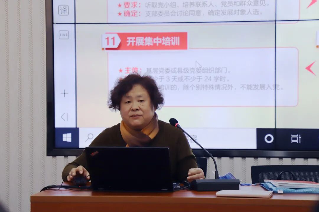 本次培训会由院学生工作办公室主任、分团委书记汪立宝老师主持,校党委组织部闫琳老师主讲。闫老师简要介绍了学校党建的基本情况,详细解读了党支部委员会职责的任务,并着重强调了发展党员的流程和规范。