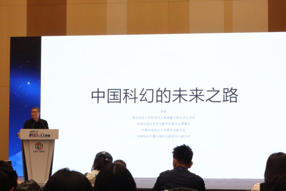 南方科技大学教授、中国作家协会科幻文学委员会副主任、中国比较文学学会跨学科研究会理事长吴岩做了《中国科幻的未来之路》的主题演讲。演讲谈到真正的写作来自人类,人工智能的参与可以让科幻写作离开作家,从而普及化。人人都能实现精准自主写作和小范围印刷传播,新的“小羊圈文学时代”将要到来。AI适应语言规律,作家突破语言规律。我们需要打破已有的科幻边间和惯性区域,建构新的模式和面向未来的科幻展望。