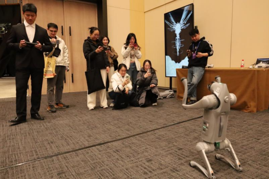 本次参访由康秋洁、赵国宁、闫行健三位老师带队。论坛开始前,场地内陈设了多个可供体验的人工智能技术前沿产品,包括机器狗、中国象棋对弈机器人等。讲解人员向同学们介绍了大语言生成模型的原理和AI在教育产业中的使用情况。