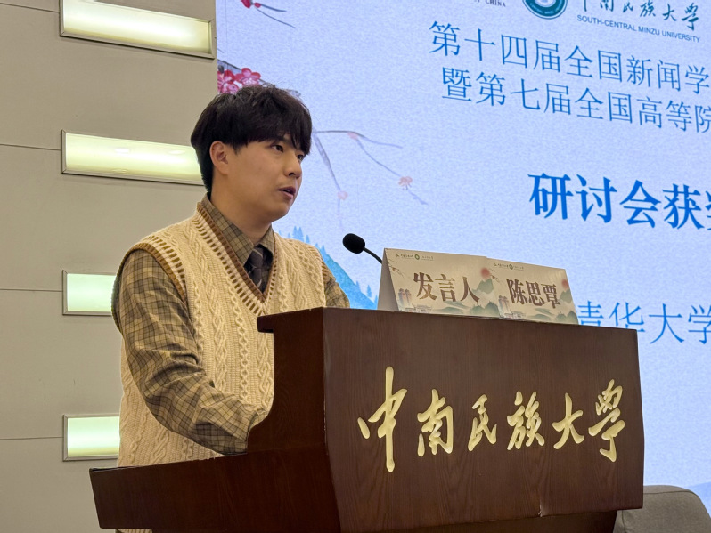 中国传媒大学博士生刘相作为本届参会代表在开幕式上发言。他提到,这是他第三次参与该研讨会,会议上的学术讨论与专家点评如活水般滋养了他的学术认知,见证了他从硕士到博士的成长。作为曾在中南民大求学的“老民大人”,刘相热情向参会者介绍校园,并以“金秋爽,丹桂香”诗意地表达了在江城武汉与各方学友交流思想的喜悦。