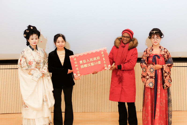 曹县县委常委、组织部部长赵洁代表曹县人民政府聘请戏剧影视学院张玲教授为“曹县汉服产业发展高级顾问”,并向学院留学生捐赠汉服30套,向子衿汉服社捐赠汉服20套,支持校园汉服文化建设与实践活动。