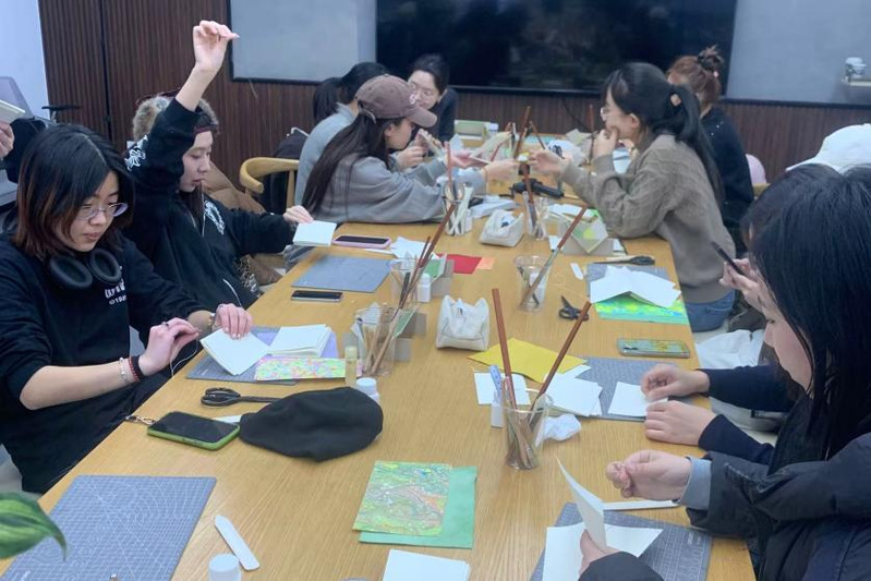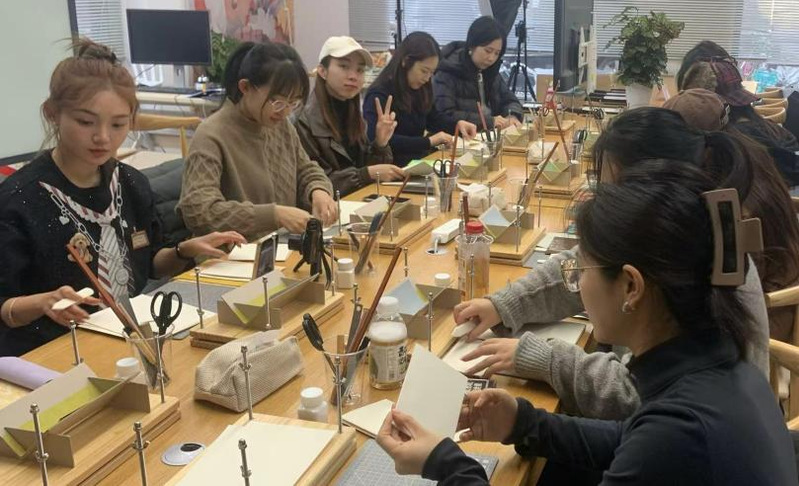 随后,在专业手工老师的指导下,同学们投入“匠心手作·自制书籍”环节。从挑选代表个人情感的封面材料,到亲手完成折纸、缝线、装订等全流程制作,大家在专注的手工体验中感受创造带来的成就感与治愈感。活动过程中,同学间互相协助、交流技法,场面温馨融洽。
